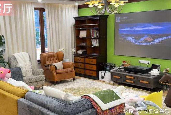 一边做成了看电影的影音空间,值得注意的是这面绿色的墙是苗苗自己买涂料来刷的,真的很会过日子。